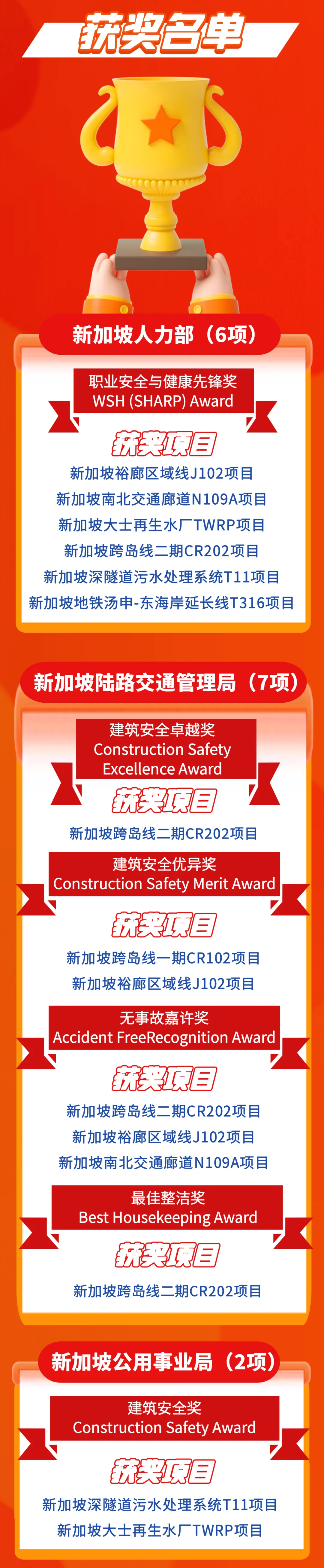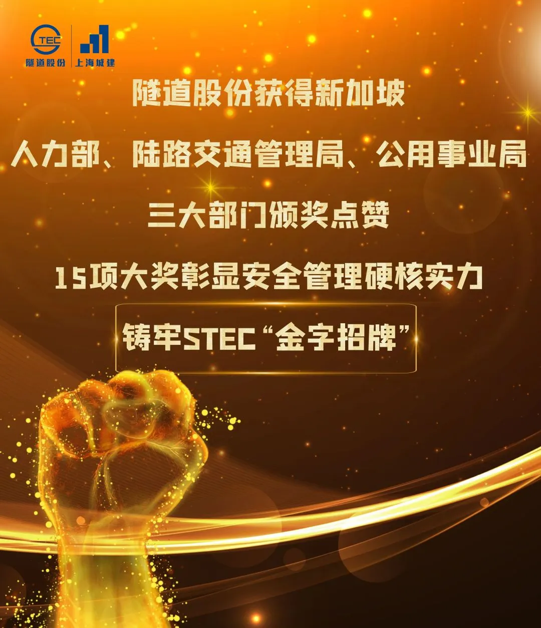 日前,隧道股份城建国际接连荣获新加坡人力部(MOM)、新加坡陆路交通管理局(LTA)、新加坡公用事业局(PUB)三大部门颁发的15项大奖,涵盖了职业安全与健康、建筑安全等多个重要领域,彰显了隧道股份卓越的项目管理能力和安全保障水平。