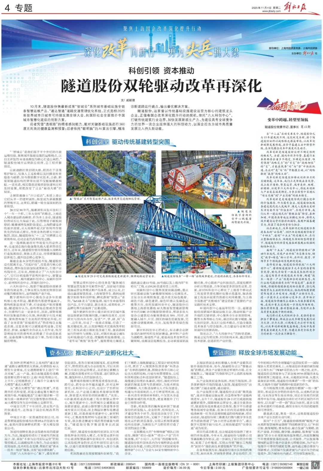 今天上午,《解放日报》专版刊发深度报道,集中展现隧道股份深入推进国企改革深化提升行动,以科创驱动转型升级、以改革破解发展难题的生动实践。