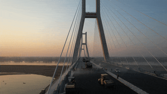 由隧道股份投资建设的兰原高速兰考至封丘段项目(简称兰封高速项目)全长30.263公里,其中跨黄河特大桥全长9104米,主桥采用140+360+360+140米三塔双索面钢混组合梁斜拉桥设计,鼎式索塔中塔高160.5米、边塔高154.3米。