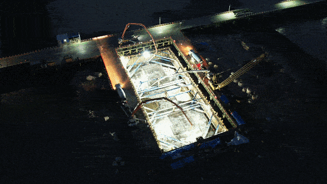 106米超深、3米超大直径桩基需穿透黄河粉细砂层,8000余方大体积混凝土承台要抢在汛期前完成浇筑,项目全员连续五天五夜“白+黑”攻坚,以“只争朝夕”的干劲推进工程建设。针对黄河粉细砂地质桩基施工易塌孔、难清孔的痛点,团队调制PHP试剂提升泥浆黏度,搭配专业清孔设备,将泥浆含砂率控制在0.2%以内,实现所有钻孔桩均达Ⅰ类桩;为破解大体积混凝土温度监测与裂缝控制难题,创新智能温控系统,在承台内布设4层冷却水管,智能调控冷却水流量,缩小承台混凝土内外温差,筑牢工程质量根基。