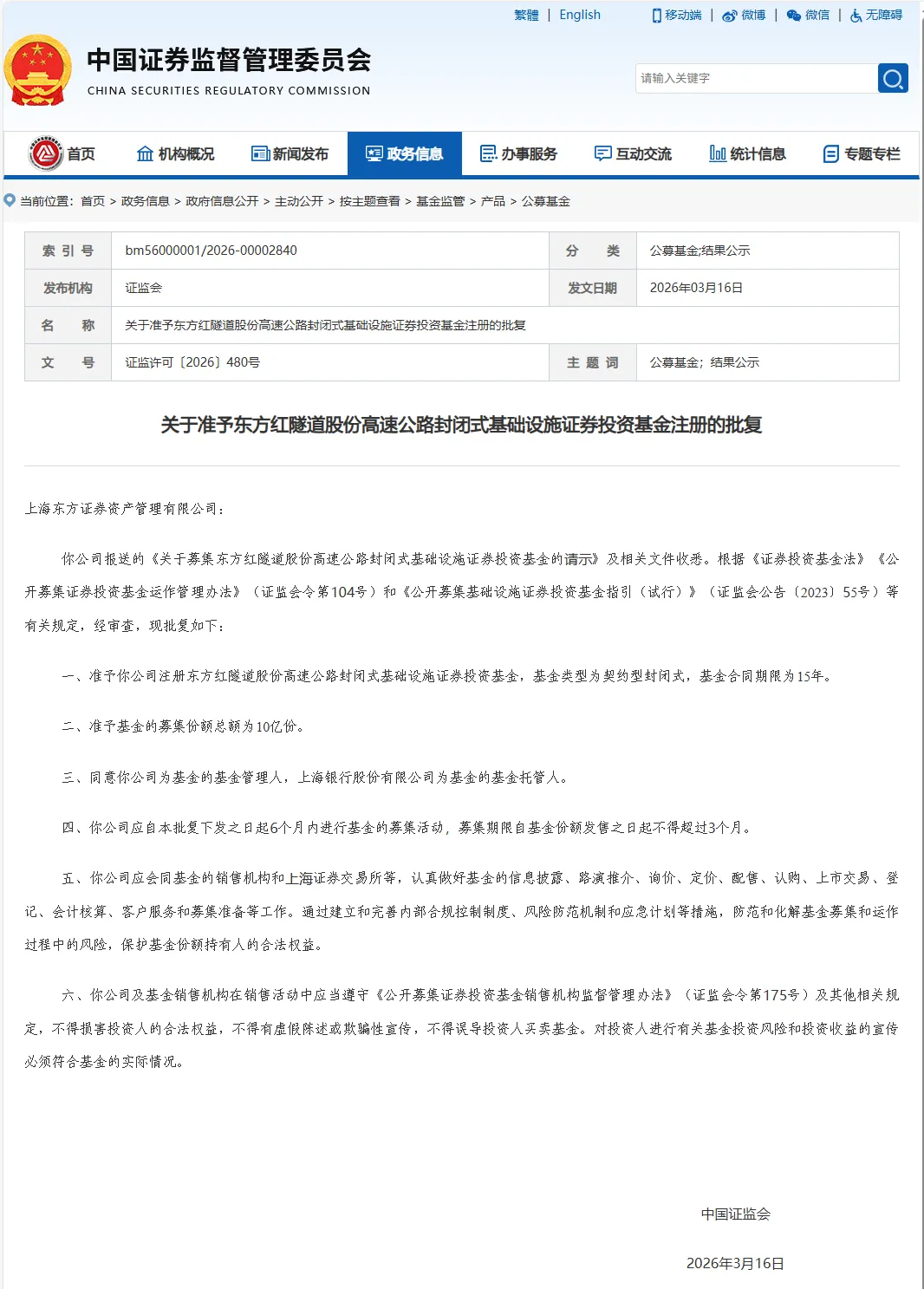 中国公募REITs市场迎来新年“开门红”。3月17日,隧道股份发布上市公司公告,由上海隧道工程股份有限公司(隧道股份)作为发起人、上海东方证券资产管理有限公司作为基金管理人、上海银行股份有限公司作为基金托管人的“东方红隧道股份高速公路封闭式基础设施证券投资基金”,正式获得中国证监会准予注册的批复。这标志着该产品成为2026年全国首个获批发行的公募REITs项目,鸣响了2026年中国公募REITs市场第一枪。